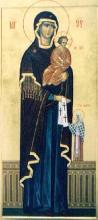 This Icon gained renown in the 4th Century on the Island of Cyprus. There, it reportedly was initially on the gates leading to one of the churches on the island. Once upon a time, a certain passing Arab was bent on committing an outrage upon the Christian holy object. He let fly an arrow, striking the knee of the Mother of God. Immediately, blood flowed from the wound, and the one who had committed the sacrilege fled in horror. He did not get far, and fell dead at the gates of his house. A monastery soon grew up on the site of the church.