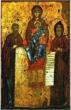 This icon was written by Venerable Alipy of the Caves. The Mother of God is depicted on this icon, seated on a throne, with her Divine Infant upon her knees. To the right of the throne stands the Venerable Theodosius, and to the left stands the Venerable Antony of the Caves. Until 1288, the icon remained in the Kiev-Caves Monastery, where it became renowned for miracles. In the following manner, it was translated in 1288 to the Bryansk-Svena Monastery of the Dormition of the Most Holy Theotokos. While in Bryansk, Roman Mikhailovich, Prince of Chernigov, became blind. Hearing of the miracles proceeding from the icon painted by Venerable Alipy himself, the prince sent a messenger to the monastery, with the request that the icon be sent to him in Bryansk, so that he might be healed. The icon, accompanied by a priest, was dispatched via the River Desna. Along its way, the boat docked on the right bank of the River Svena. The following morning, the travellers went out to the boat in order to pray before the icon. However, they did not find it there. They beheld it standing amid the branches of an oak tree, on a hill opposite the Svena River. After word of this came to Prince Roman, he was brought on foot to the icon. Praying fervently, the prince promised to build a monastery on this site, and to give to it all of the lands visible from the hill. After these prayers, the prince gradually began to regain his sight. At first, he saw the path, then nearby objects, and finally all of his surroundings. After venerating the icon, the prince had a moleben served. After the moleben, all of those present erected there a wooden church dedicated to the Dormition of the Most Holy Theotokos. They cut down the tree in which the icon had rested, and used its wood to fashion boards upon which to write other icons. At the same time, it was determined that the Svena Icon of the Mother of God would be celebrated on 3 May.