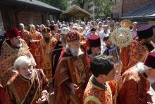 Затем начались молебен и крестный ход (благо стояла отличная погода). По их завершении, Первоиерарх поздравил всех с праздником и поблагодарил клир собора за его спасительный труд. После этого митрополит наградил протоиерея Иоанна Барбуса, настоятеля Спаса-Преображенского прихода в городе Балтиморе орденом Курской-Коренной иконы Божией Матери «Знамение» II степени. Отец Иоанн служит в этом приходе более 15 лет.